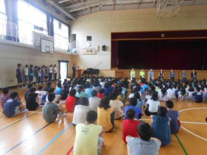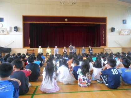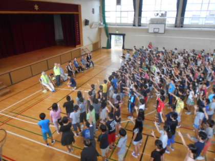 老人クラブの皆さまには、毎日、子どもたちの登下校の安全を見守っていただいています。集会のプログラムでは、全校児童と王様ジャンケンゲームを一緒に楽しんでいただきました。