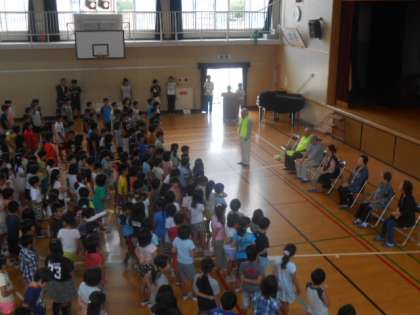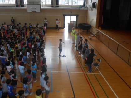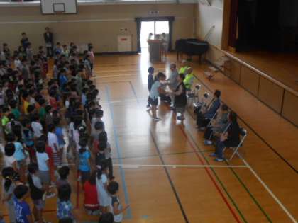 楽しいゲームの後、老人クラブの石野会長様より、「いつも児童のみなさん達の元気な姿から元気をもらっています。」とお言葉をいただきました。そして、児童代表とプレゼントの交換をして、日頃のお世話に対して感謝の気持ちを伝えました。