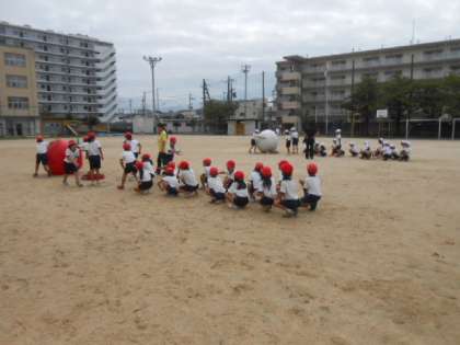 運動会の練習は、団体演技に加えて、団体競技も始まりました。2年生は、「大玉ころがし」、3年生は、「綱引き」を力いっぱいだしてがんばっていました。
