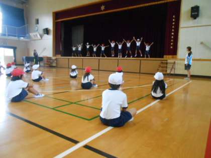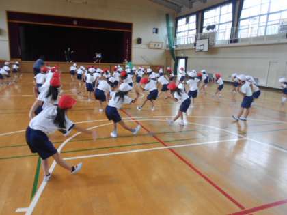 運動場が、昨夜からの天候でぬかるんでいるため、1,2年生が、体育館で、団体演技の練習をしました。互いによいところを見習いながら、よりよい演技表現に仕上げていっています。