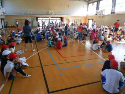 今日の児童集会では、集会委員会による「猛獣狩り」というゲーム集会をしました。集会委員会が、「猛獣狩りに行こうよ!猛獣なんか怖くない!槍だって持ってるし!鉄砲だって持ってるし!・・・」という歌の掛け合いで、出題された動物名の文字数の友だちを集めます。互いに呼び合っていろいろな友だちが即座にでき、仲間作りが楽しくできました。