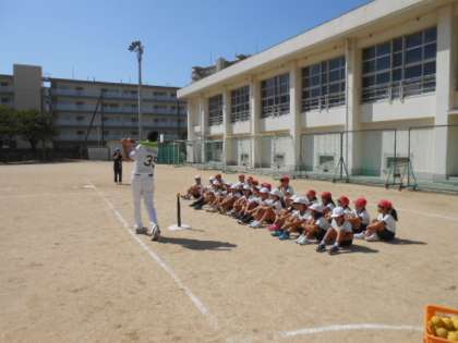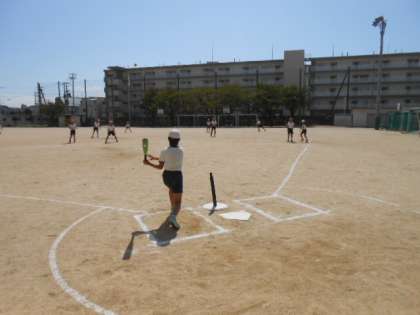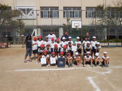 基本の練習をした後、チーム対抗でティーボール(ベースボールを易しくしたゲーム)を楽しみました。