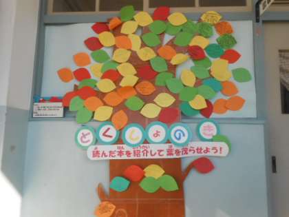 また、図書室の入口には、「どくしょのき」があります。児童のおすすめの本や読んだ本が紹介されています。