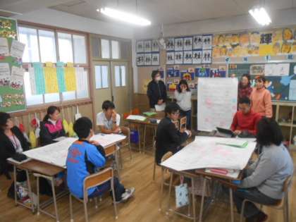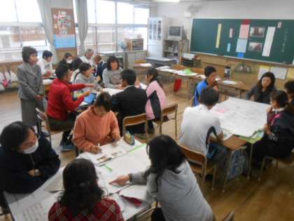 4年生の授業を参観し、教職員の指導力向上の研修を行いました。大阪市教育センターの教育指導員を講師に招き、研究課題「自分の思いや考えを豊かに表現する子どもを育てる」について意見交流、協議の後、指導助言を受け、よりよい指導のあり方を探求しました。