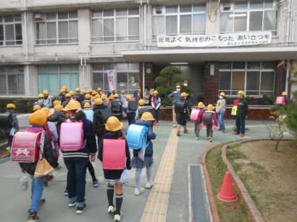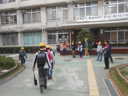校舎の前で、登校する児童のみなさんに、元気な声であいさつをしてくれました。