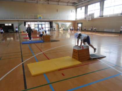 2年生が、体育館で跳び箱を使った運動遊びをしました。自分の能力に合った段を選んで、繰り返し跳ぶことを楽しんでいました。