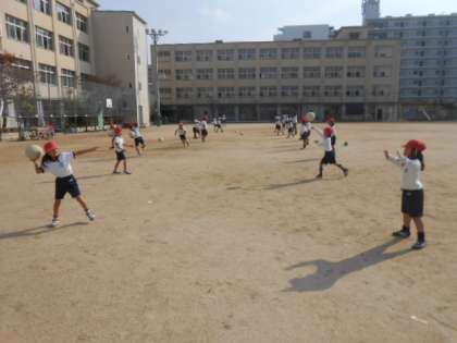 また、運動場では、「ポールゲーム」の学習をしました。友だちと向かい合ってボールを投げたり受けたりしてボールの感覚を楽しんでいました。