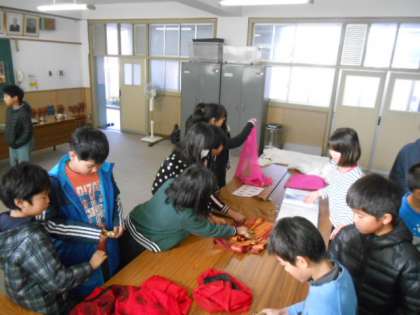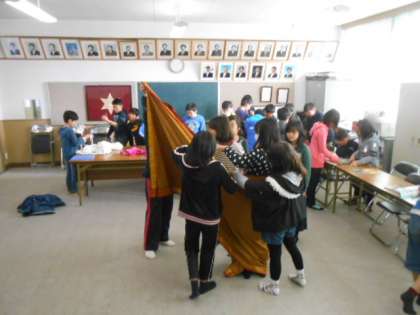 今週、国立民族博物館から、みんぱっく「インドのサリーとクルター 」の貸し出しをしていただき、会議室に展示しています。日頃、手にすることがない品物に触れ、児童たちは、インドの文化について興味や関心を持つことができました。