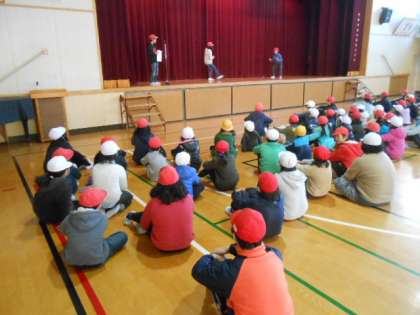 今朝、3学期初めての児童集会がありました。集会委員会の児童が、去年話題になった出来事や人物を舞台で演じて3択クイズを楽しくしてくれました。有名なシーンばかりで、会場が盛り上がりました。