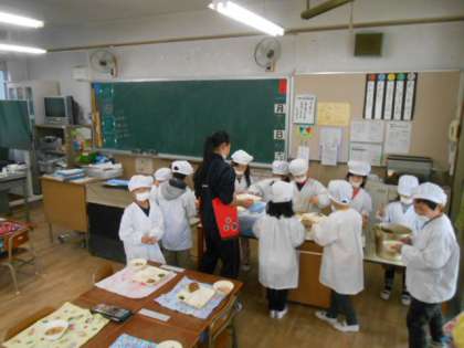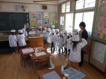 1年生の給食準備を手伝ってもらいました。そのあと、持参のお弁当を子どもたちと一緒に食べて楽しく過ごしてもらいました。