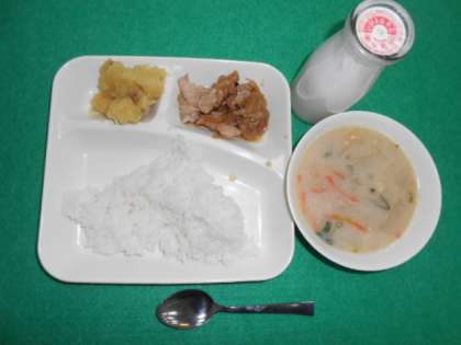 1月31日の給食献立は、鶏肉の甘辛焼き、かす汁、くりきんとんです。
