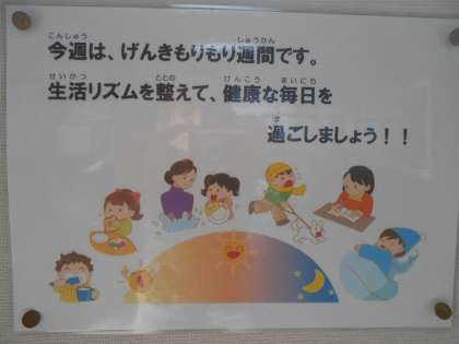 今週は、元気もりもり週間です。「早ね、早おき、朝ごはん」をはじめ、毎日を規則正し生活リズムで過ごすように心がけましょう。ご家庭でもご協力をよろしくお願いいたします。