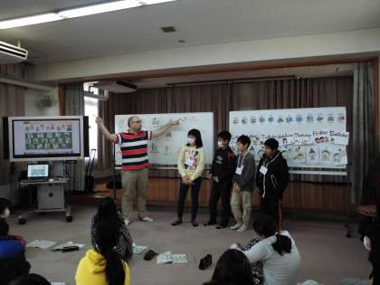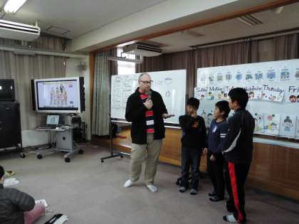 いろいろな教科を英語で発音したり、1日の時間割を聞き取ったりしました。また、ペアになって、英語を聴いて消しゴムを取り合うゲームを楽しみました。