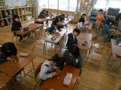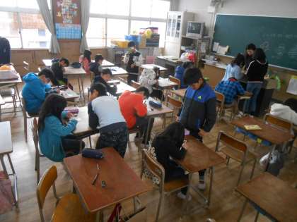 今日の全校朝会のあと、1〜5年生は、たてわり班に分かれて、「卒業おめでとう集会」で6年生への贈り物づくりをしました。高学年児童が、低学年児童に優しく教えてくれました。