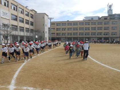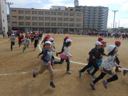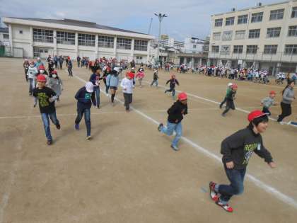 風邪の流行もおさまり、元気な全校児童は、かけ足に取り組んでいます。前半は学級ごとに並んで走り、後半は自分のペースで走ります。