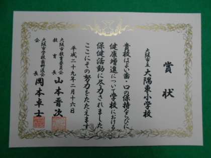 本校が、よい歯・口の保持増進の取り組みに努力したことについて、大阪市教育委員会、大阪市学校歯科医師会から表彰状をいただきました。これは、本校の児童のみなさん全体が、1年間を通して、がんばった結果で、とてもうれしいです。