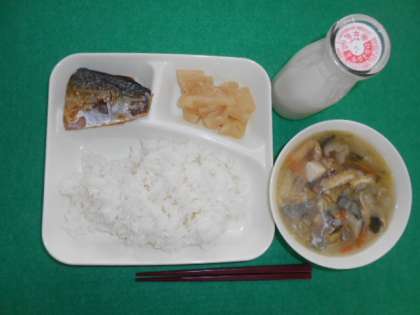 本日の献立は、さばの塩焼き、五目汁、だいこんのみそ煮、米飯、牛乳です。