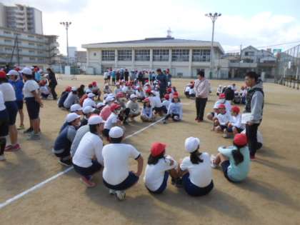 5時間目、本校の運動場で瑞光中学校区の3小学校(小松、大隅西、大隅東)の6年生が一堂に会して「スポーツ交流会」を開催しました。