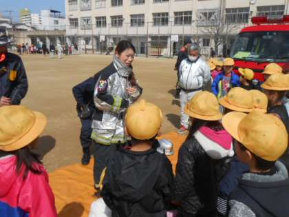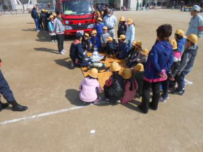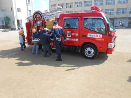 低学年の児童は、水槽付ポンプ車についてと服装の装備についての丁寧な説明に一所懸命に話を聞いたり、質問したりして関心を持って見学していました。