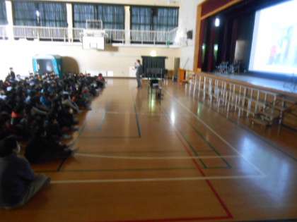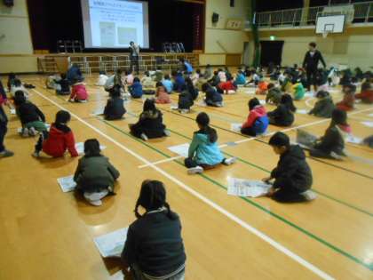 運動場での体験活動のほかに、体育館では、低学年が古新聞紙を使ったスリッパ作りをとおして災害時の工夫の一端を体験しました。また、高学年は、熊本地震や阪神淡路大震災の映像を見て、災害時避難所の様々な状況を知り、自分の住む地域で大震災が起こった時は、どのようなことに気を付けなければならないかを学びました。