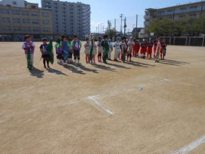 澄んだ青空のもと、大隅東小学校運動場で「連合子供会キックベースボール大会」が開催されました。