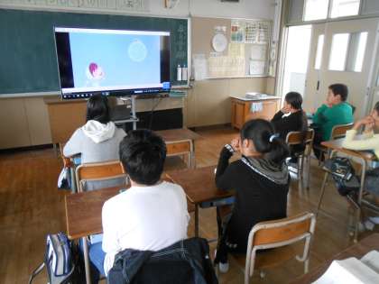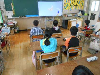 大型テレビの映像と音声から感じたことを話し合ったりして英語に親しみます。