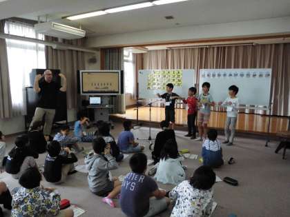 (上) 5年生は、Hi friends P8の曜日を英語で歌いました。また、ジェスチャーをつけ、感情を英語で歌うゲームとゴールデンウィークのお話をしたりして楽しく活動しました。