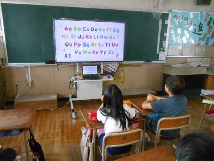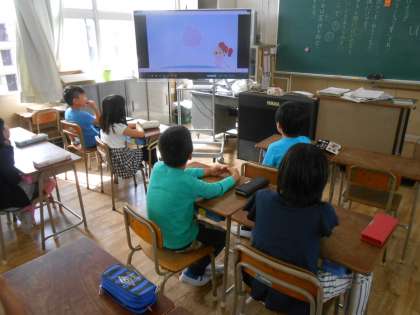 毎週火曜日、朝の時間(15分)に全学年が、英語活動をしています。15分のモジュール学習を基本にします。1学期は、週1回実施し、2学期から2回の実施を予定しています。まずは、英語の音声やリズムを楽しんだり、推測してお話を聞く楽しさを味わったりして、英語に親しむことから始めています。
