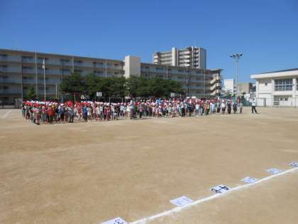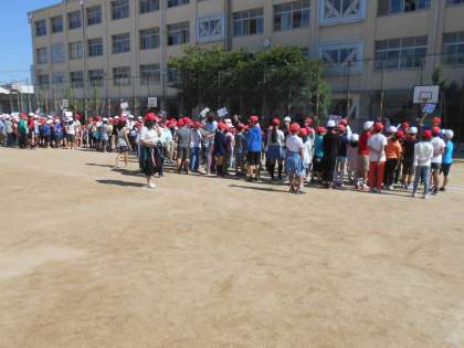 今朝の児童集会は、明日の全校遠足の備え、たてわり班の編成をして、並び方を確認した後、班のメンバーで「だるまさんが転んだ」を楽しみました。