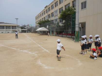 大きなソフトボールを小さな手で持って、思い切り投げていました。