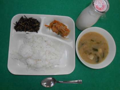 さけの野菜たっぷりあんかけ、みそ汁、まぜまぜふりかけ、米飯、牛乳です。