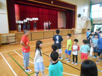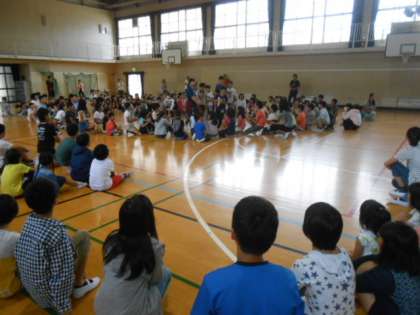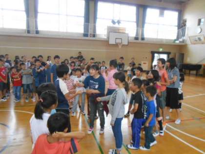 肩に手を置いてつながった列車を班ごとに作ります。音楽に合わせて移動し、先頭がジャンケンをして負けた班が後ろにつながっていきます。全学年の児童ができる簡単なゲームなので、楽しく盛り上がりました。
