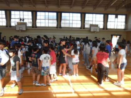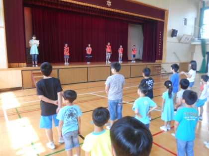前回にした「猛獣狩り」の昆虫バージョンをしました。司会の「昆虫取りに行こうよ!」・・・「てんとうむし」(6文字)など昆虫の名前の文字数に合わせた人数のグループを作るゲームを楽しみました。