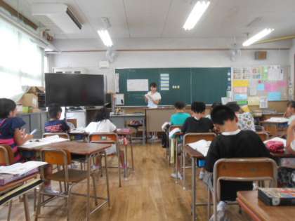 3年1組が、算数科授業「わり算を考えよう」で「23個のケーキを4個ずつ箱に入れます。全部で箱はいくついりますか?」の学習をしました。公開授業として本校教員の研修も行いました。児童は、割り切れない場合のわり算で、問われている答えの言い表し方について考えを出し合いしっかりと理解しました。