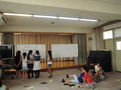 単語の複数形と単数形のつづり表記や発音の違いを学びました。また、アルファベットで単語のつづりを作るゲームで英語で楽しみました。