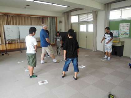 6年生は、「”Lesson4”道案内をしよう」をしました。目かくしたエリック先生をいろいろな店に案内するゲームを英語で楽しみました。