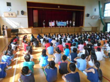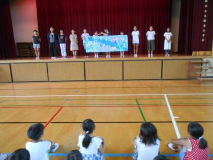 今朝の児童集会は、新聞・掲示委員会が発表しました。全校遠足、好きな教科など学校生活に関わって取ったアンケートの結果発表と玄関掲示「7月七夕」製作活動について、どの子もはきはきした力強い声で、今日の本番に備えて、練習もがんばったことが伺える発表でした。