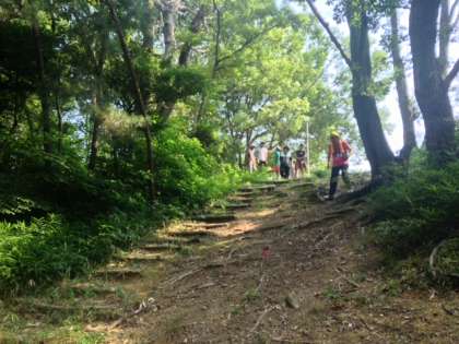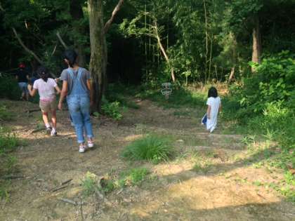 サマーキャンプの2日目、朝食後の活動でフリスビーディスクゴルフを楽しみました。森の中に藪や芝生など自然そのままのコースでゲームを楽しんでいました。