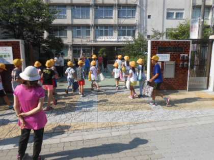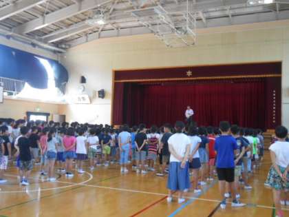 続いて生活指導部の先生から、毎日の登下校を見守っていただいた、地域、保護者の方へ、夏休み中に合った時も、お世話になったお礼の気持ちを伝えるようにあいさつをしましょうとお話がありました。そして、集団登校のリーダーとして毎日頑張った登校班の班長さん、副班長さんへ全校児童から大きな拍手を贈りました。
