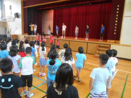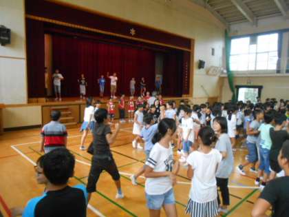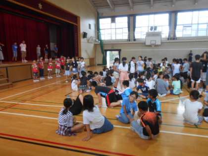 「猛獣狩りに行こう」ゲームをアレンジした「海外旅行に行こう」をしました。集会委員会が出題する外国の国名の文字数でグループを作るゲームです。約10分ほどの短い時間でしたが、1〜6年生が楽しく活動しました。