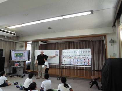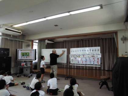 5年生は、英語による月と曜日の歌を歌いました。そして、「Hi friends」で色や形の言い表し方を英語で学びました。