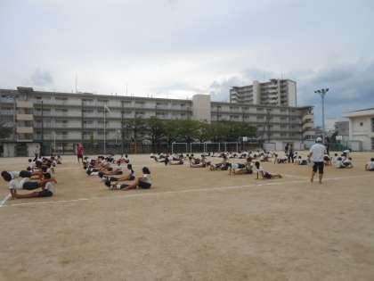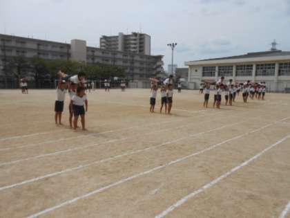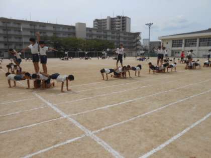 6年生は、最後の運動会になります。組体操に始めて取り組む5年生をリードして、練習に励んでいます。