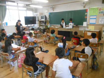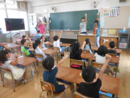 運動会に向けて、6年生が1年生の教室へ運動会の歌と応援の出前練習に来てくれました。