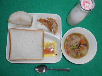 今日の献立は、あげギョーザ、鶏肉と冬瓜の中華煮、梨(豊水)食パン、ジャム、牛乳です。