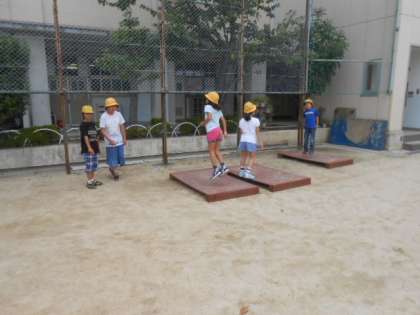 夏季休業日中に区内の小中学校の管理作業員さんに、ジャンピングボードを作製して頂きました。縄跳びの二重跳びの練習にとても役立ちます。