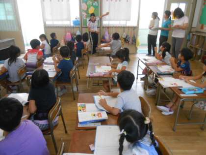 今日の5時間目に、1年2組が、国語科単元「おはなしをたのしんでよもう」で教材「サラダでげんき」の授業に取り組みました。教員研修の公開授業で、多くの教員が見守るなかで、児童は、一人ひとりがしっかりと声をだして音読をし、担任の発問に自分の考えをはっきりと発表していました。