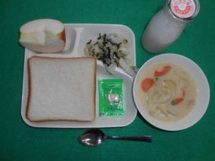 内容は、コーンクリームシチュー(米粉)、キャベツのひじきドレッシング、りんご、パン、牛乳です。