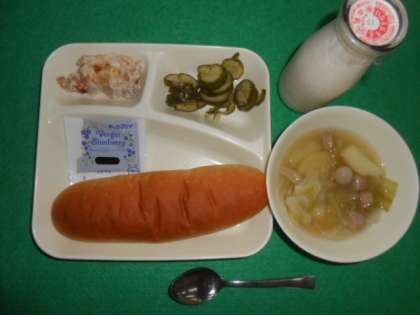 今日の献立は、鶏肉のマリネ焼き(ノンエッグドレッシング)、スープ煮、きゅうりのピクルス、パン、牛乳です。鶏肉のマリネ焼きの味付けのノンエッグドレッシングは、マヨネーズ風味ですが、卵を使用していません。