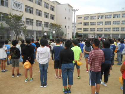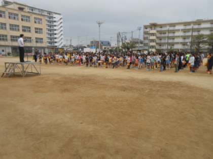 今朝の児童集会は、東淀川警察署による「誘拐防止」のお話です。昨今、幼児、児童が、犯罪に巻き込まれる事件が、後を絶ちません。東淀川警察署生活安全課防犯係の方から危険な目に合わないように全校児童に分かりやすくお話をして頂きました。お話の最後に防犯標語「いかのおすし」の紹介がありました。「いかのおすし」とは「いかない、のらない、おおきなこえをだす、すぐにげる、しらせる」のかしら文字をとった防犯標語です。