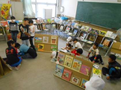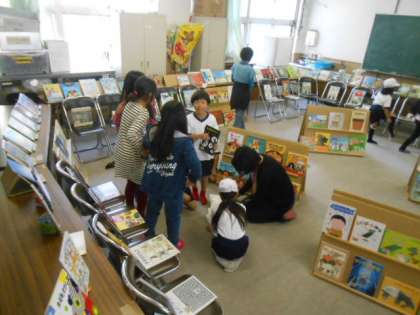 6日(月)2時間目と給食の後の休み時間に、会議室で「えほんのひろば」が、開催されました。中央図書館からお借りした絵本を中心に楽しくディスプレイしていただき、たくさんの子どもたちが、お話の世界を楽しみました。